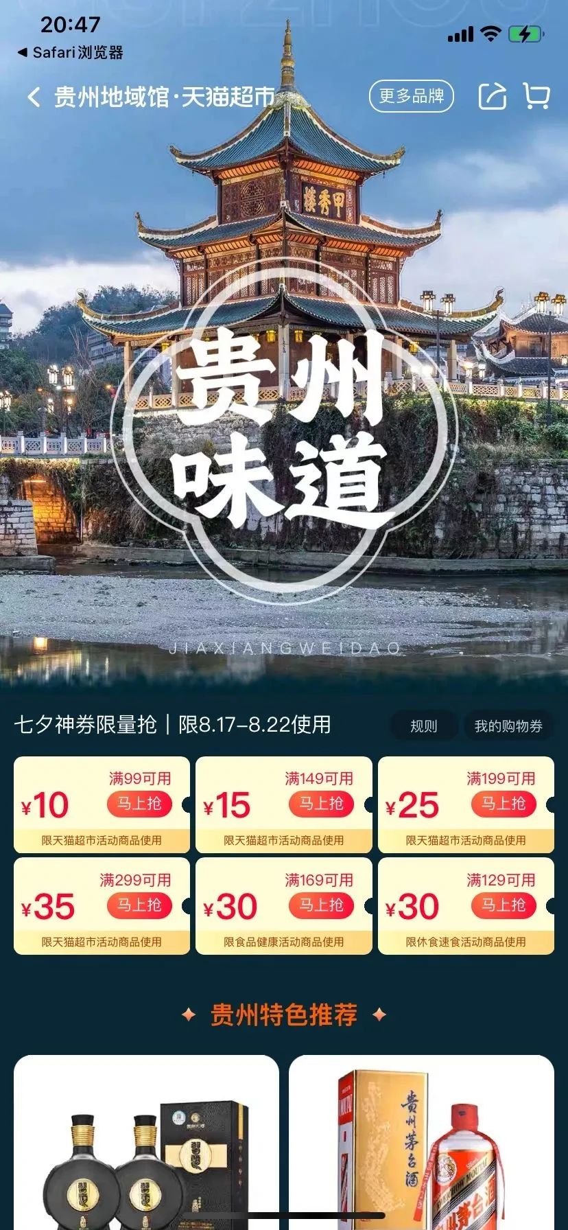 “目前,天猫超市贵州馆目前在售的贵州特色商品品类有十余种,涵盖白酒、茶叶、辣椒酱、薏米等,同时还有遵义特色羊肉粉、非遗技艺猪肉脆哨、高原特产刺梨等特色商品。消费者可通过淘宝app进入天猫超市,搜索‘贵州’或‘贵州特产’直达特色馆进行购买。”天猫超市相关负责人说。