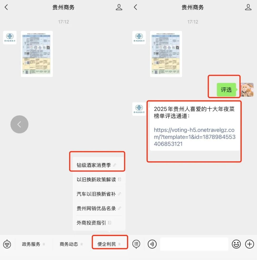 广大网友可通过“贵州商务”“享趣贵州”等公众号,进入“2025黔菜钻级酒家餐饮新春消费季”评选栏目或发送关键词“评选”,点击弹出投票通道即可进入投票平台,为喜爱的年夜菜品投票。