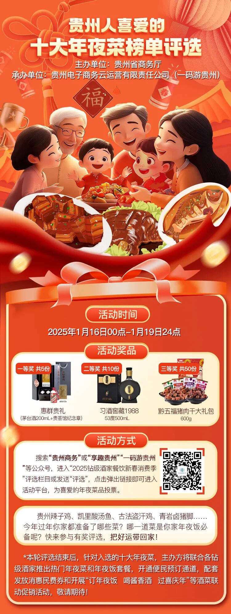 本轮评选结束后,针对入选的十大年夜菜,贵州省商务厅将联合“一码游贵州”平台,联动各钻级酒家推出热门年夜菜和年夜饭套餐,开通便民预订通道,配套发放惠民消费券和开展“订年夜饭喝酱香酒过喜庆年”等酒菜联动促销活动,敬请期待。