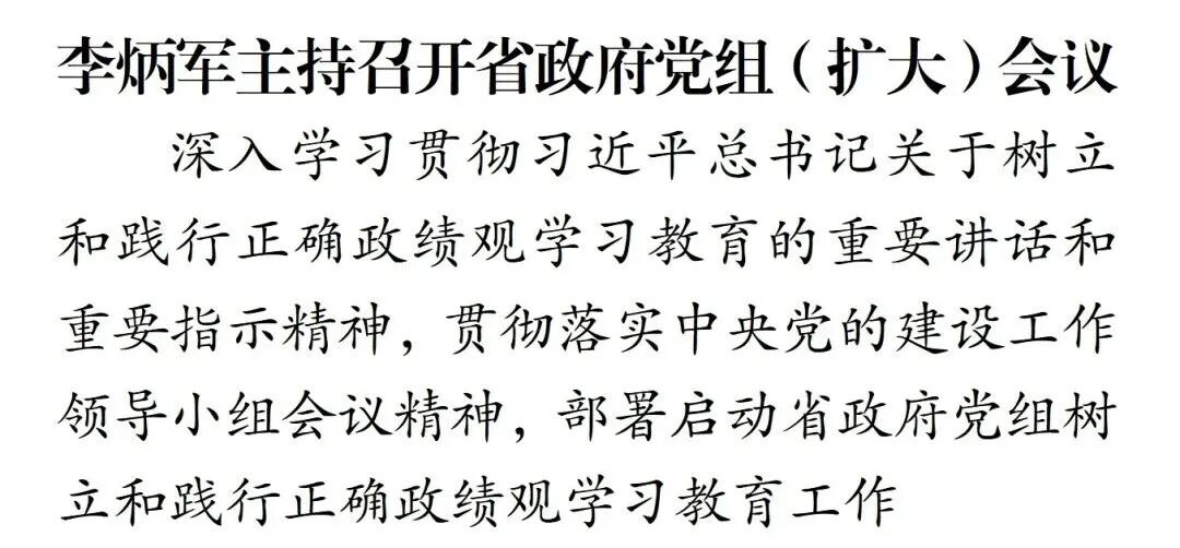 3月2日,省长、省政府党组书记李炳军主持召开省政府党组(扩大)会议,深入学习贯彻习近平总书记关于树立和践行正确政绩观学习教育的重要讲话和重要指示精神,贯彻落实中央党的建设工作领导小组会议精神,按照省委要求,部署启动省政府党组树立和践行正确政绩观学习教育工作。省政府党组成员参加。